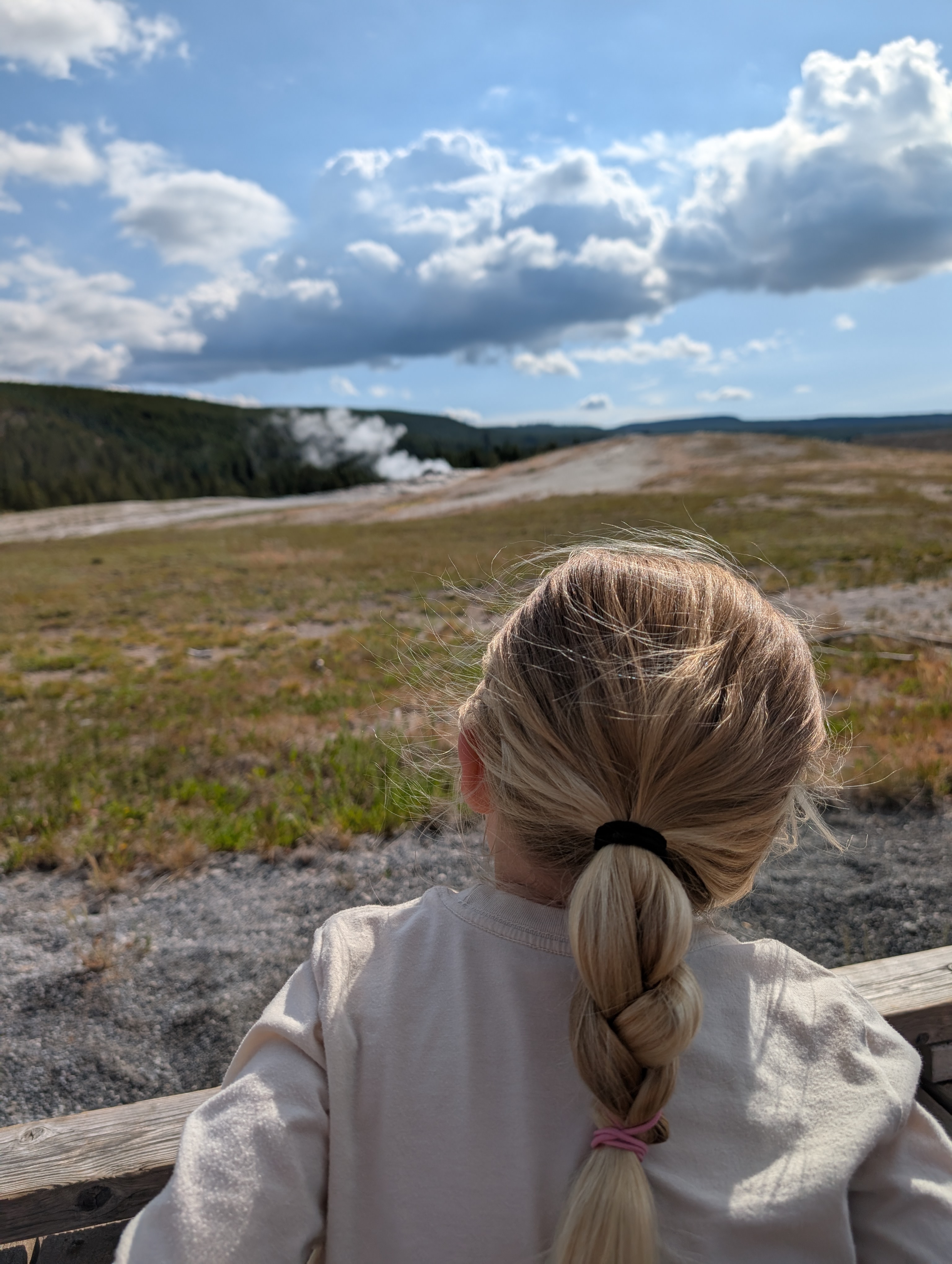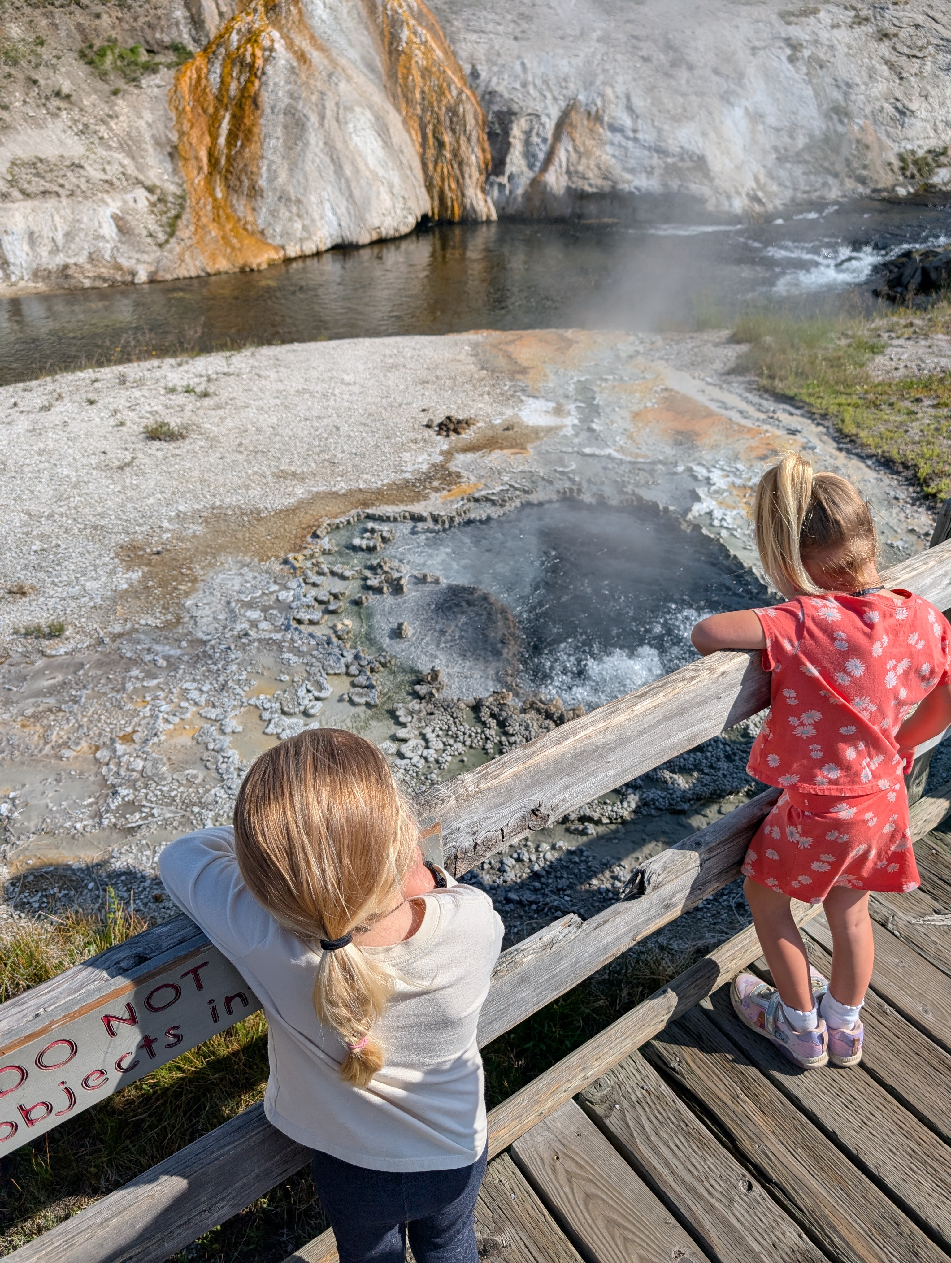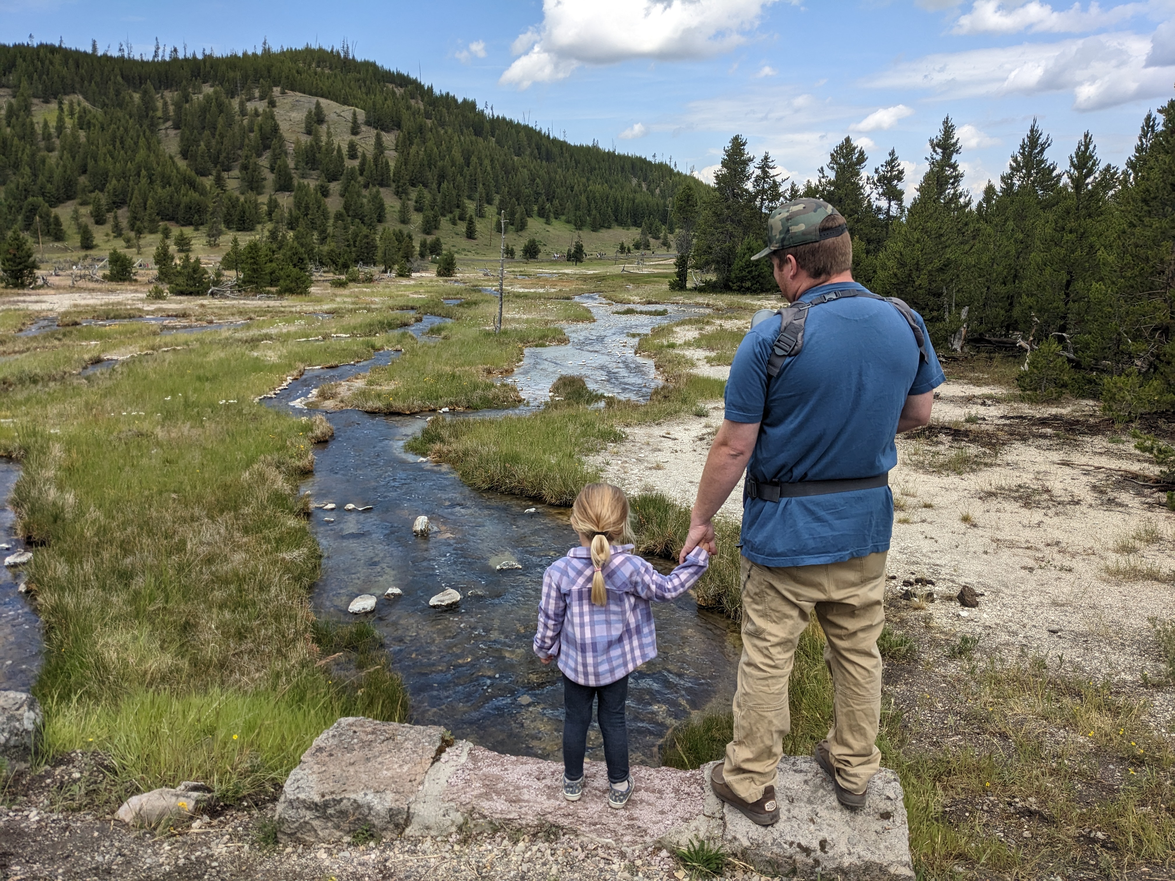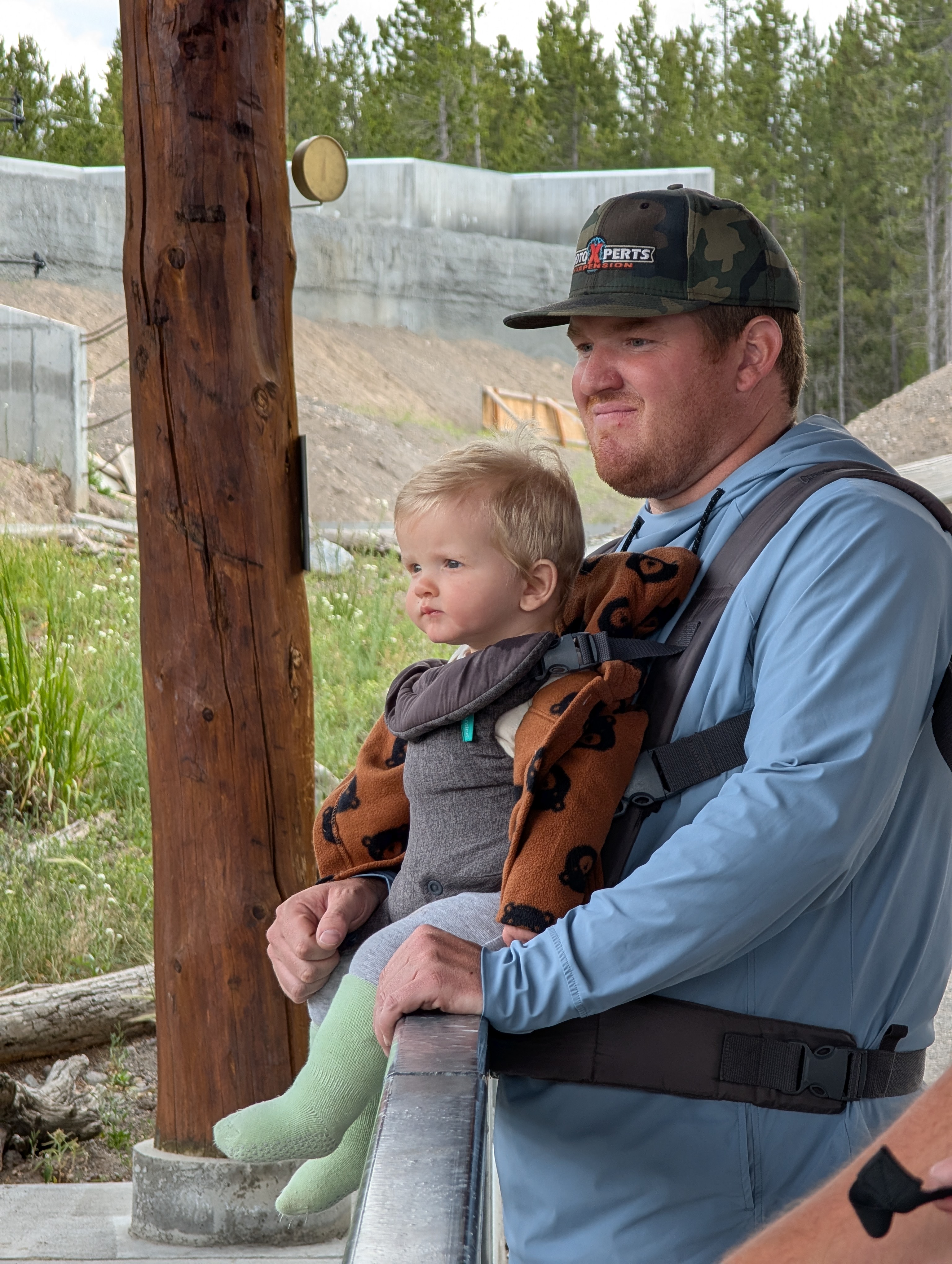 Saturday we started bright and early to beat traffic into the park. We watched Old Faithful erupt, wandered the boardwalks with bison nearby, and had little dance parties along the way. James and I admired the beautiful lodge architecture while we waited out a quick rainstorm. At Grand Prismatic Spring, the kids splashed in puddles before Charlee proudly turned in her completed Junior Ranger book. Ice cream was a must after that—while Dawson was getting a diaper change, Charlee ordered her own cone.