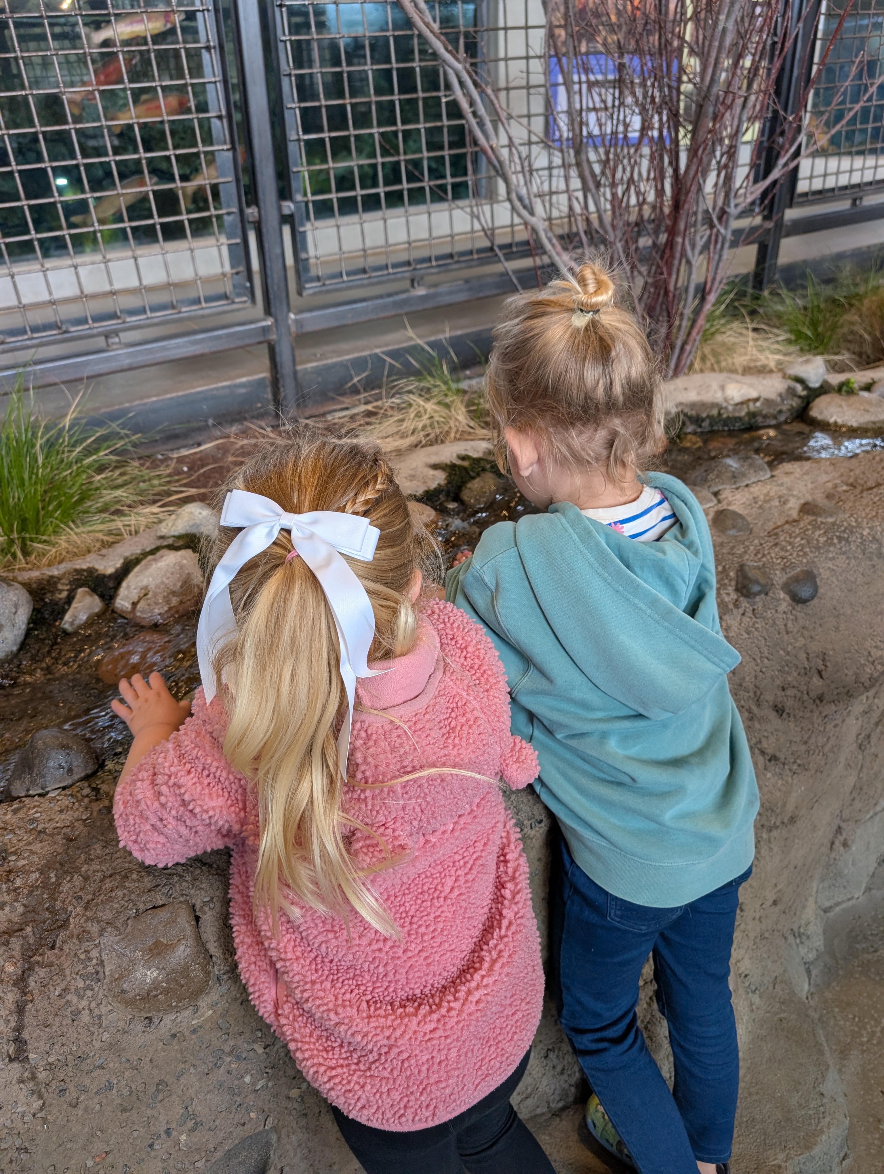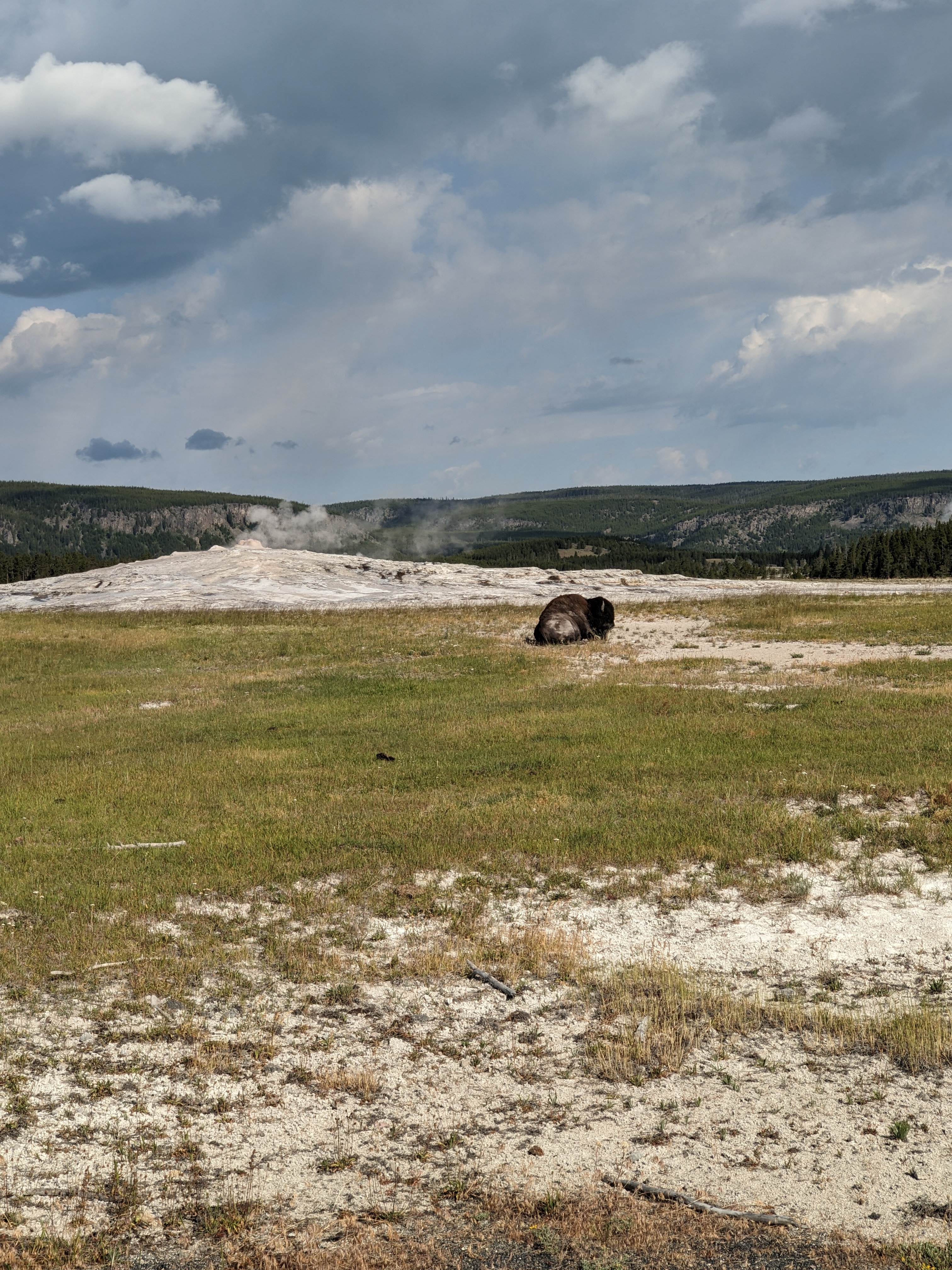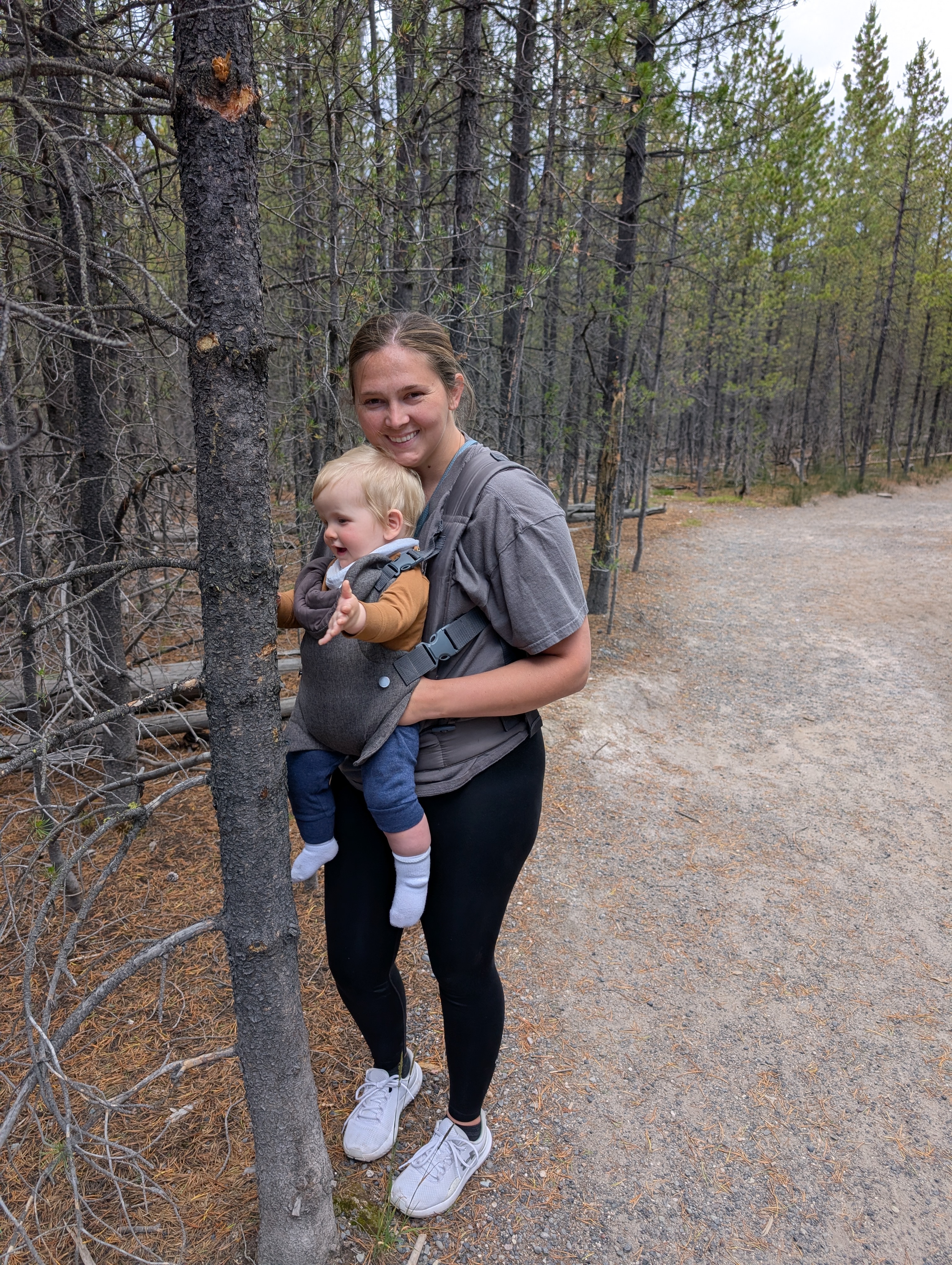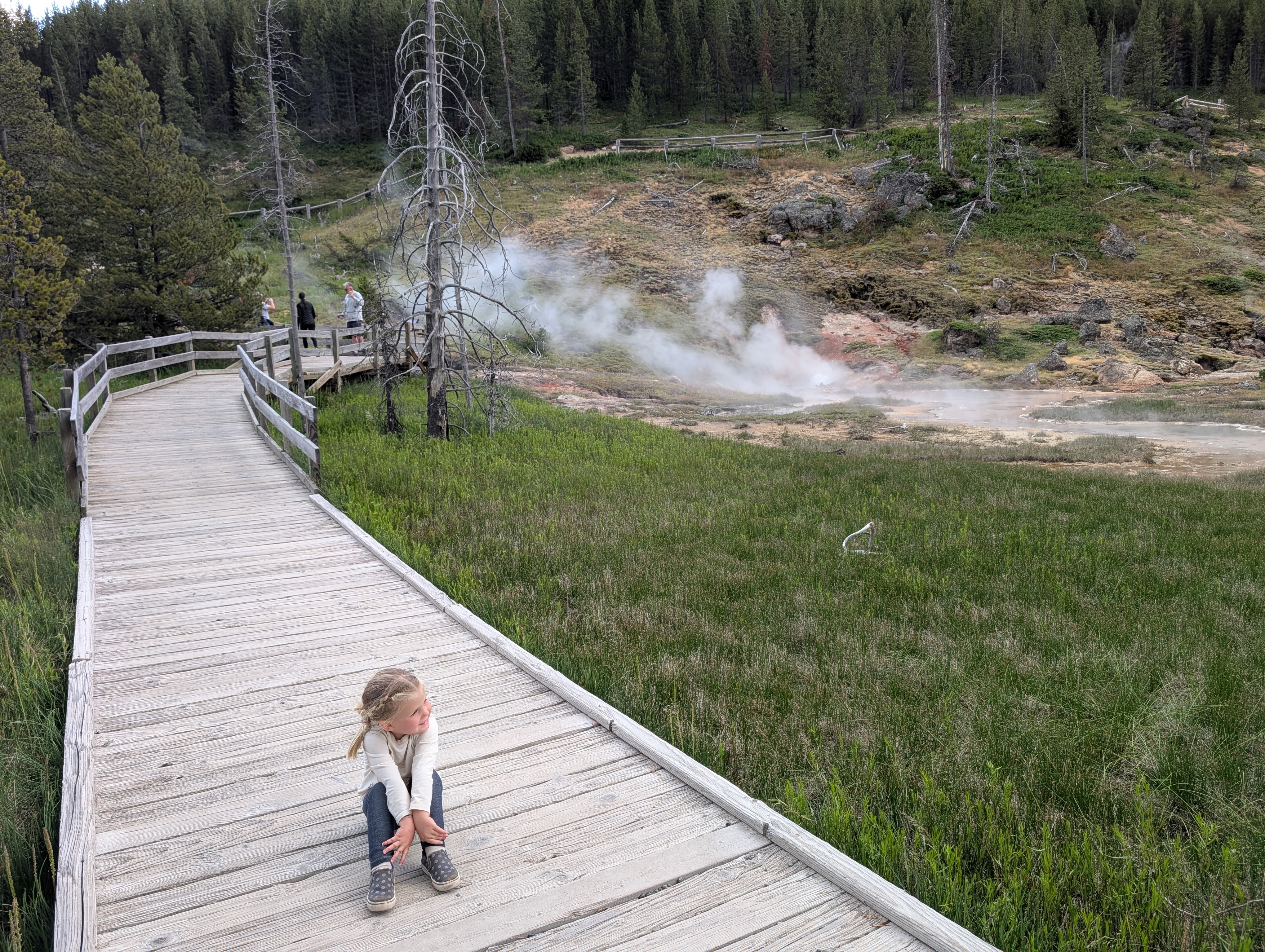 Saturday we started bright and early to beat traffic into the park. We watched Old Faithful erupt, wandered the boardwalks with bison nearby, and had little dance parties along the way. James and I admired the beautiful lodge architecture while we waited out a quick rainstorm. At Grand Prismatic Spring, the kids splashed in puddles before Charlee proudly turned in her completed Junior Ranger book. Ice cream was a must after that—while Dawson was getting a diaper change, Charlee ordered her own cone.