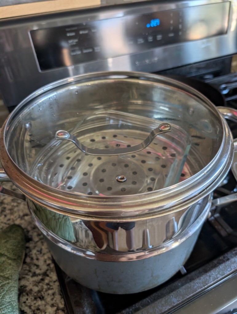 - Set up the double broiler: Place a saucepan with a little water on the stove. Put a heat-safe bowl on top so it rests above the simmering water.
